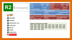 This route is a uni-directional service from Prince George’s Park Terminal to Kent Vale, via BIZ2, Central Library & University Town. Trips in the other direction are operated as Service R1.