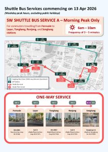 Shuttle A & B will operate during weekday morning & evening peak hours respectively, from 13 April to 16 October 2026. During this period, Sengkang LRT West Inner Loop will not be in operation from 19 April to 18 October 2026.