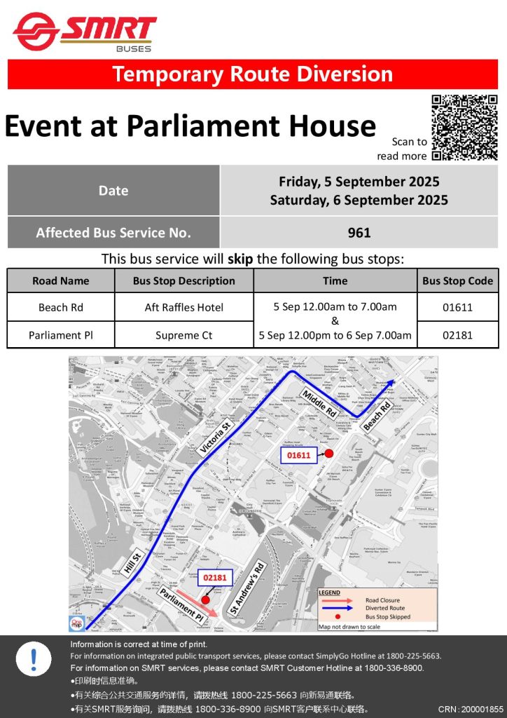 SMRT Buses Temporary Route Diversion Poster for Event at Parliament House (Sep 2025) SMRT Buses Temporary Route Diversion Poster for Event at Parliament House (Sep 2025) SMRT Buses Temporary Route Diversion Poster for Event at Parliament House (Sep 2025)