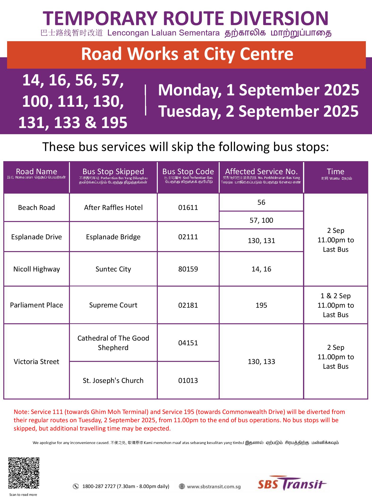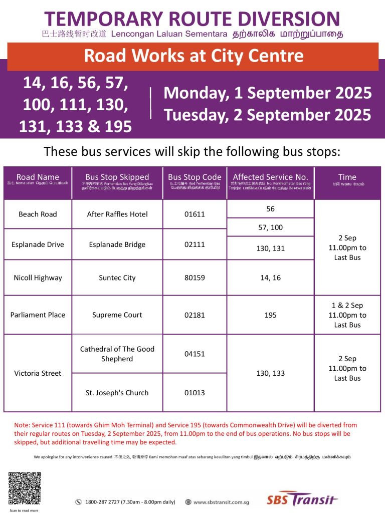 SBS Transit Temporary Route Diversion Poster for Road Works at City Centre (1 & 2 Sep 2025)