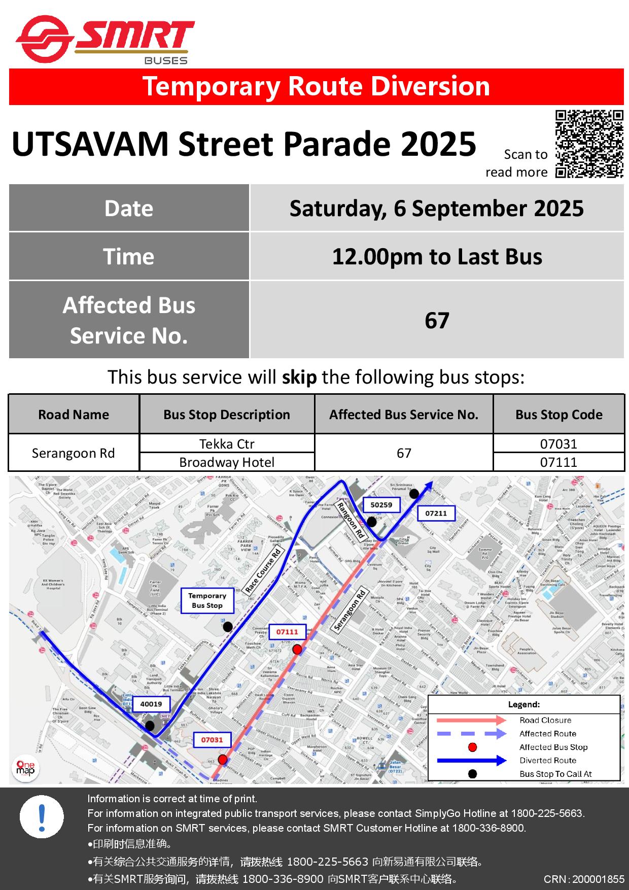 SMRT Buses Temporary Route Diversion Poster for UTSAVAM Street Parade 2025