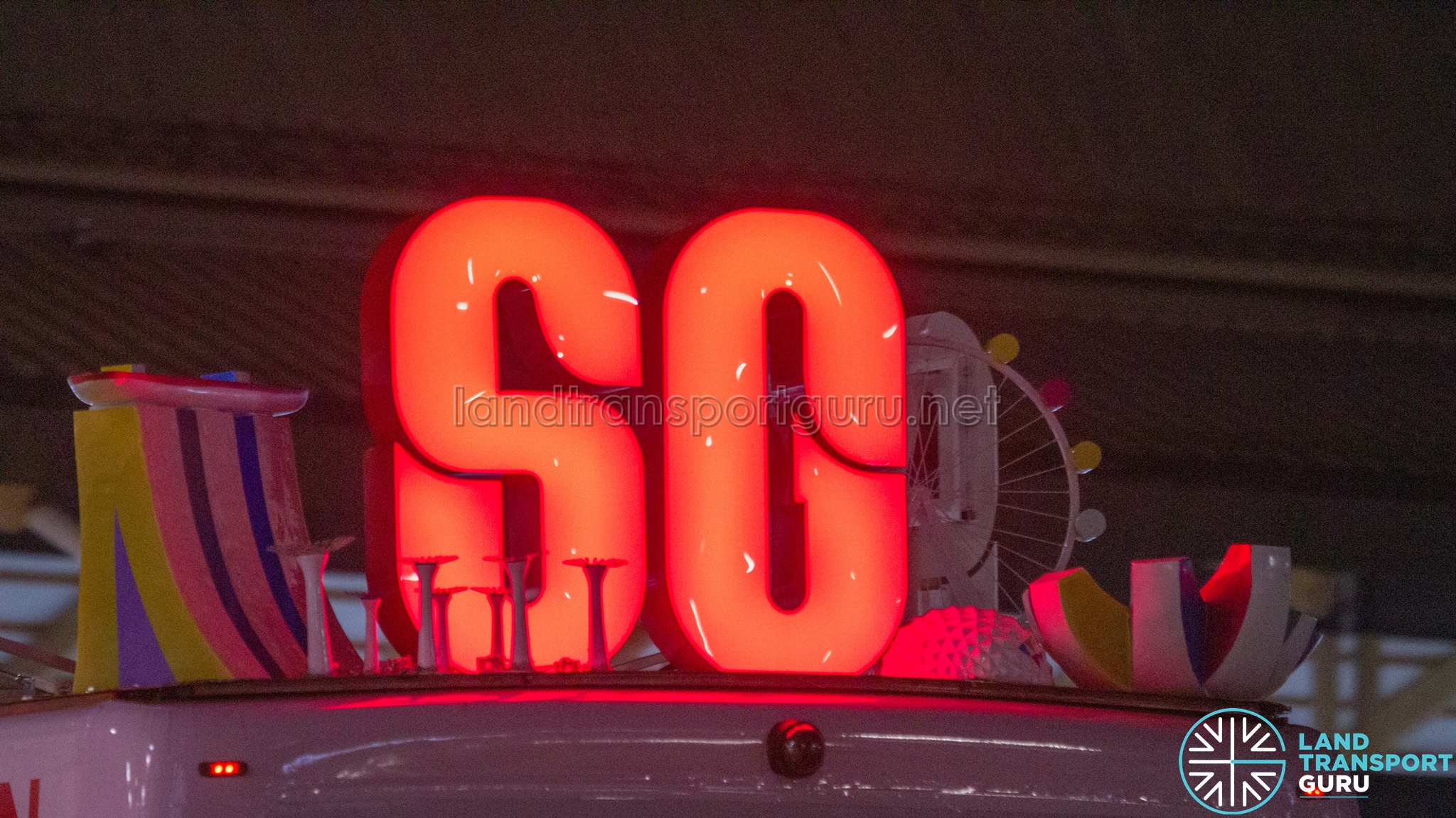 On the roof, a design that blends “SG” and “60” into one unified shape is mounted facing the rear. A 2D version of this is mounted on the sides of the roof. At night, the 3D sign would be illuminated.