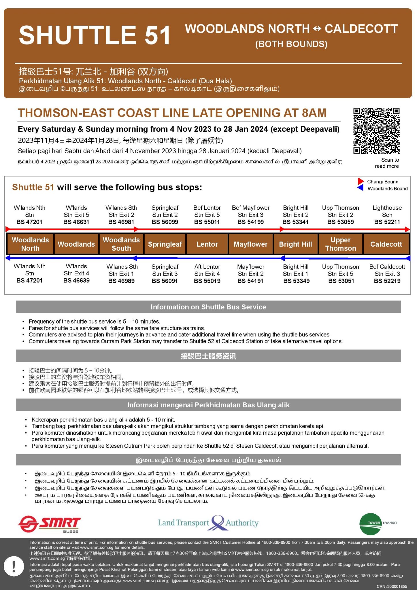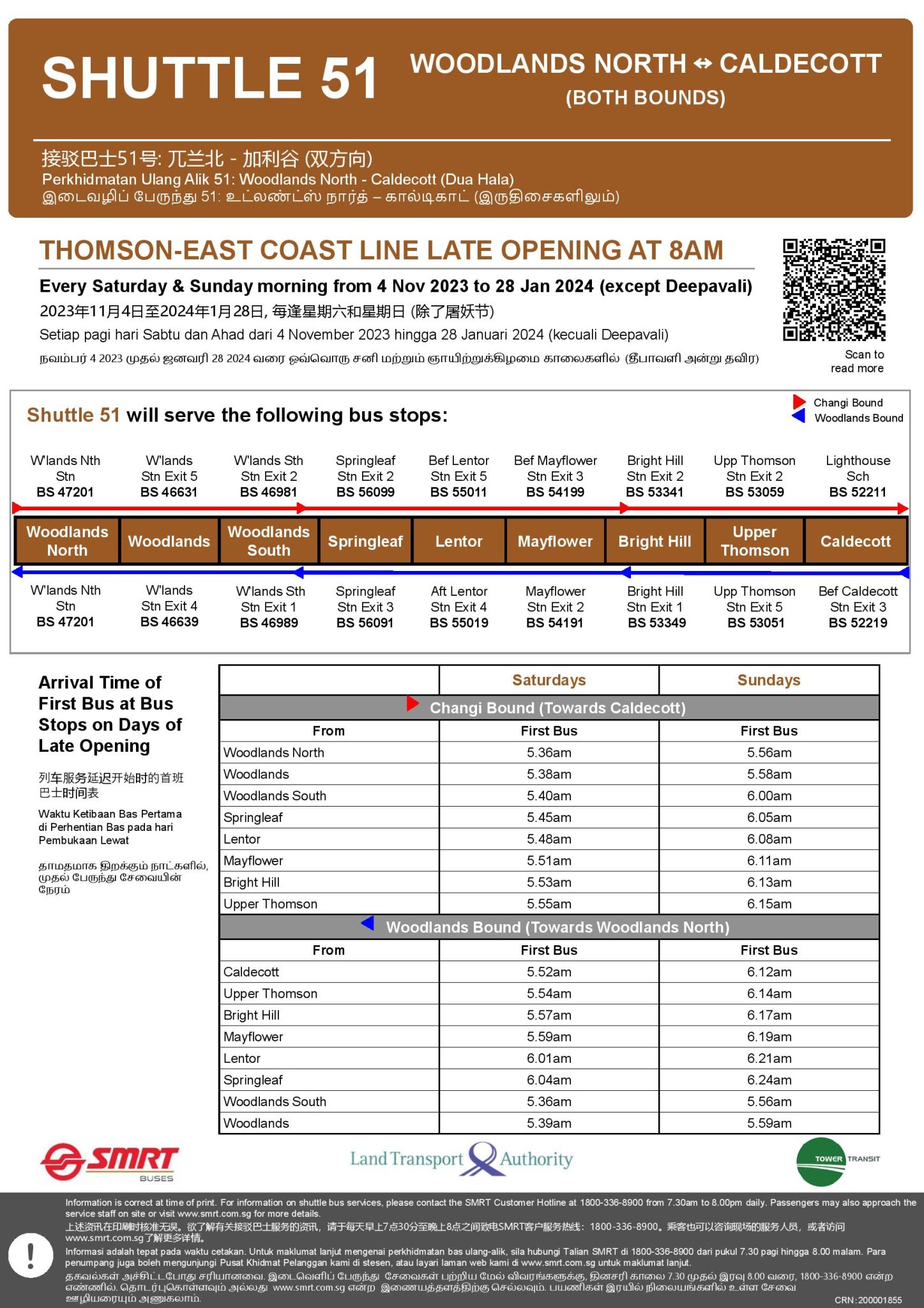 Shuttle 51 is a Rail Replacement Service plying between Woodlands North – Caldecott, serving en-route Thomson-East Coast Line (TEL) stations.