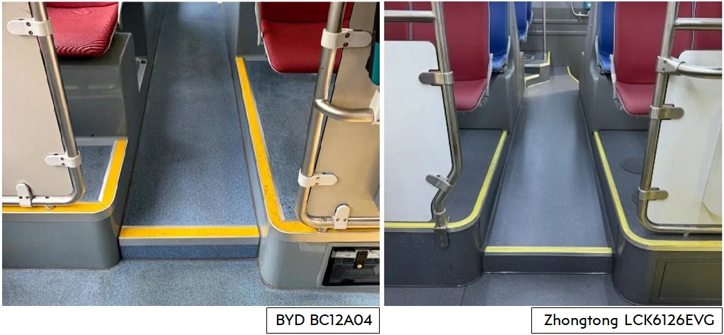 Inside, each bus has 12 priority seats in the front section. While four are on the flat floor level, the remaining eight sit above the front wheel wells, requiring passengers to climb a high step.