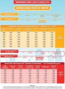 Weekends & Public Holidays 10:30*, 11:40*, 12:50*, 14:00*, 15:00, 15:45, 16:25, 17:05, 17:55* & 19:05* Departures with * serve intermediate stops within Tampines town. Refer to section on intermediate stops below. |